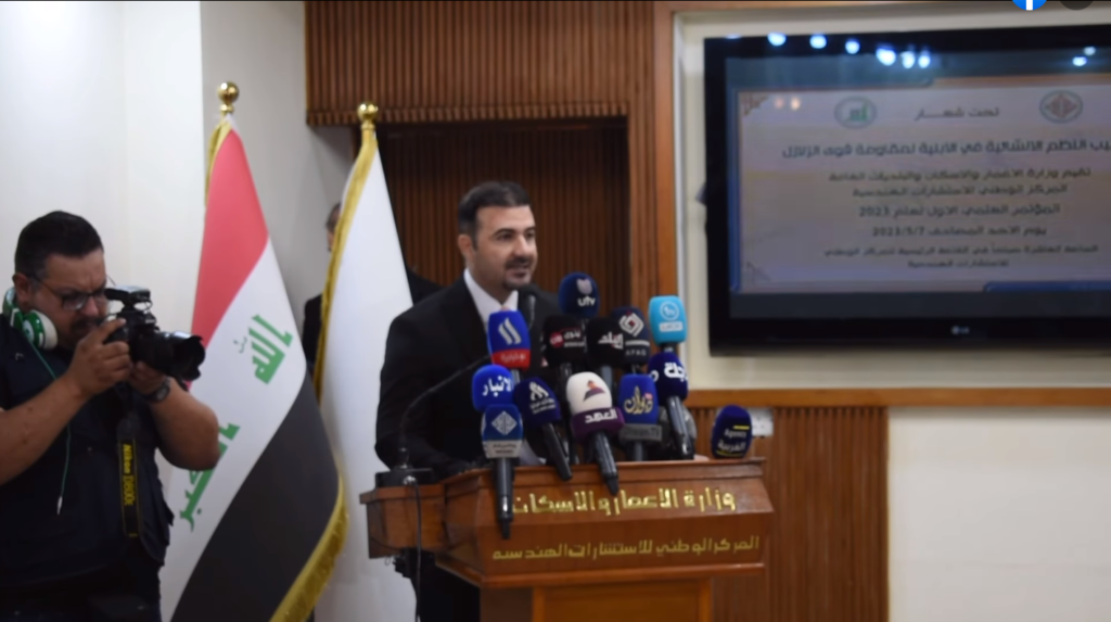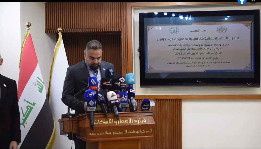 بحضور معالي وزير الاعمار والاسكان والبلديات العامة الاستاذ بنكين ريكاني والسادة النواب ووكلاء الوزارة والمدراء العامين . عقد المركز الوطني للإستشارات الهندسية صباح يوم الاحد الموافق 7 أيار لعام 2023 المؤتمر العلمي الاول الخاص بقوى الزلازل والاساليب المتبعة في التصاميم والبناء للحيلولة من مخاطره . تضمن المؤتمر عزف السلام الجمهوري والاستماع الى تلاوة من الذكر الحكيم وقراءة سورة الفاتحة على ارواح الشهداء الابرار . تلا كلمة مدير عام المركز الوطني ورئيس اللجنة التحضيرية المهندس المعماري حسن مِدِّب مِجحم عن منجزات المركز ومشاريعه وكانت اخرها عقد مؤتمرات علمية رصينة تخدم المواطن وتجنبهُ المخاطر بصورة علمية هندسية في التصاميم والبناء بإعتبار ان العراق اصبح ضمن الخط الزلزالي بعد احداث تركيا وسوريا .